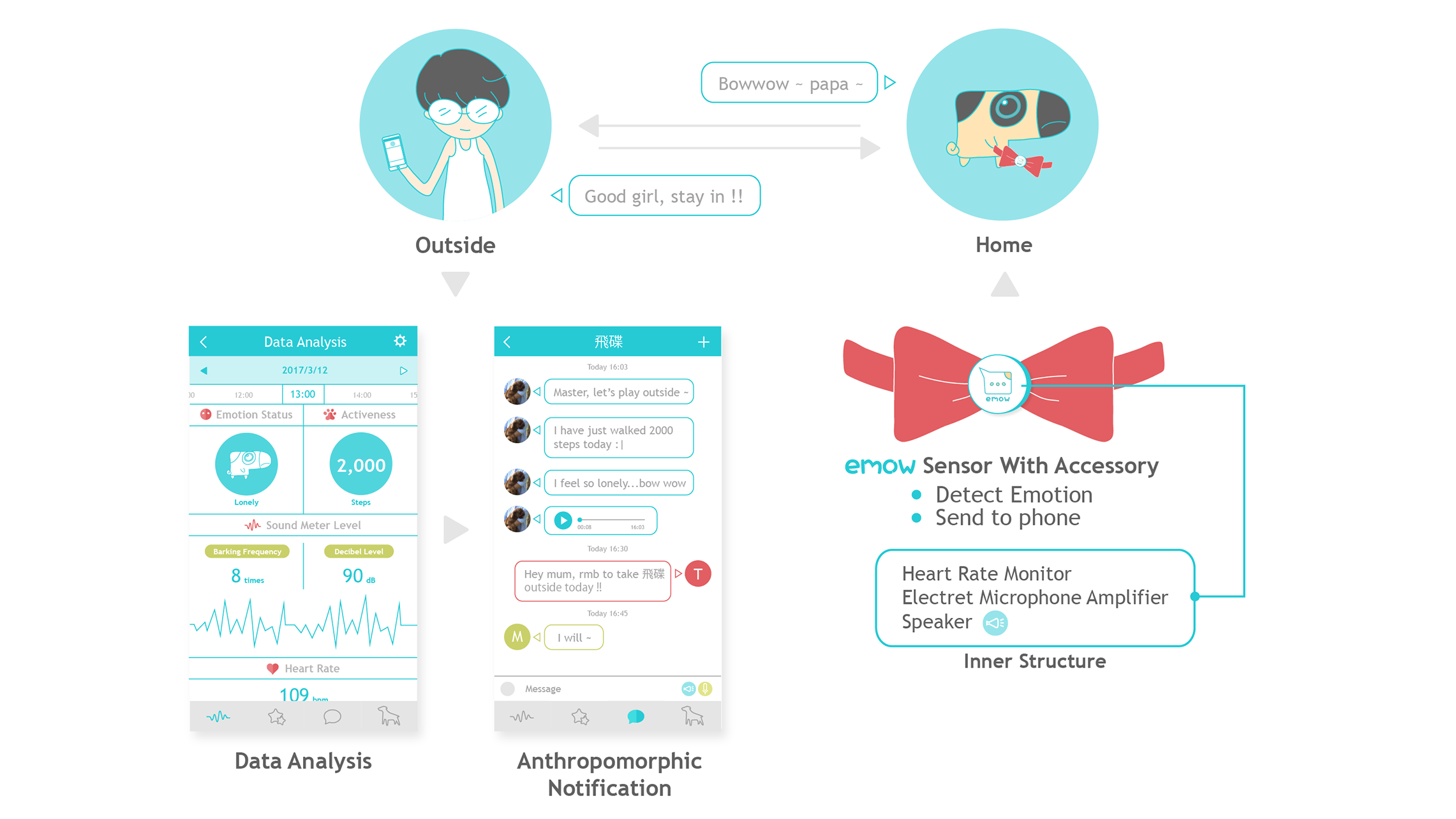 A pet emotional wearable to assist owners better understanding the feeling of their pets. It is designed to allow owner access their pet’s emotion status and health data from an anthropomorphic chat.
